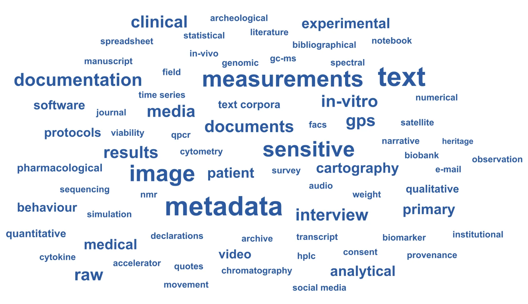 This word cloud was generated by summarizing the answers of workshop participants to the question"What are research data?"